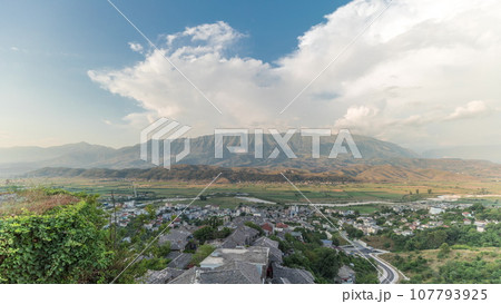 Panorama showing Gjirokastra city from the viewpoint of the fortress of the Ottoman castle of Gjirokaster timelapse.