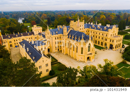 Aerial view on the medieval castle Lednice. South Moravian region