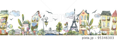 A horizontal board with a panorama of the streets of Paris, with houses, a tower, cafes, flowers. Watercolor illustration in the style of a sketch from a large set of PARIS. For decoration, design.