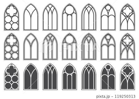 Gothic windows with pattern. Church glass arches. Vintage medieval cathedral architecture frames on white background. Catholic stained interior decoration. Silhouette of old door shapes. Vector