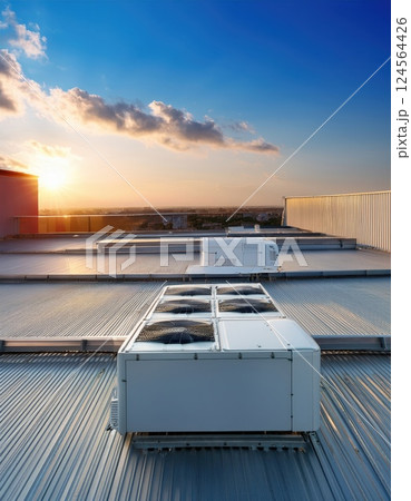 Rooftop air conditioning units overlooking a sunset in an urban landscape during the evening hours Generative AI