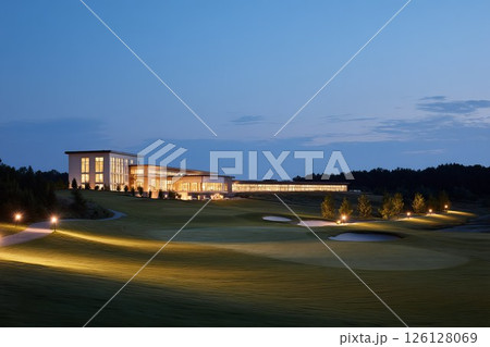Modern golf clubhouse illuminated at dusk with manicured greens and serene landscape