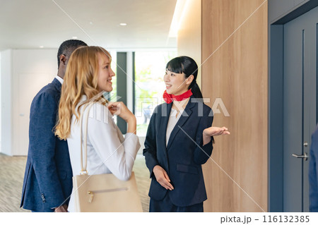 黒人男性旅行客に部屋を案内する女性ホテルスタッフ