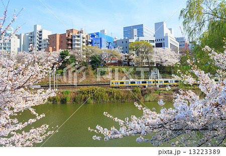 東京の桜名所 外濠公園 新見附橋から望む東京都心の町並み 市ヶ谷方面