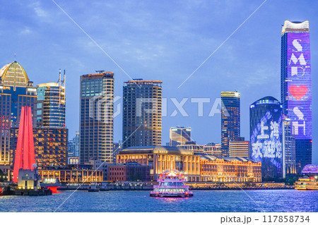 中国/上海 外灘(バンド)のビル群と黄浦江の船