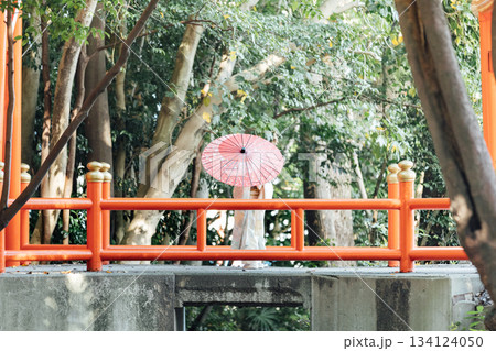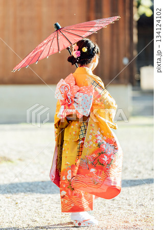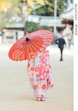 七五三で和傘をさして神社にお参りをする女の子
