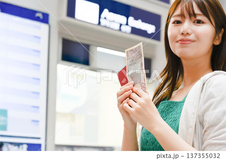 空港で両替をする女性 「撮影協力:関西国際空港(KIX)」