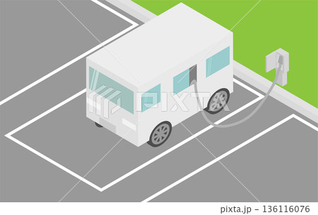 アイソメトリックな窓から電源ケーブルを引き込み充電するワンボックスカーのイラスト素材