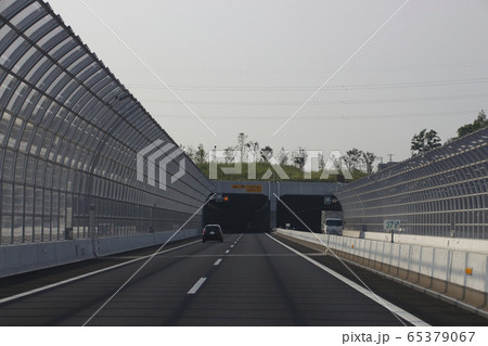 東京外郭環状道路の防音壁のある夕暮れの風景