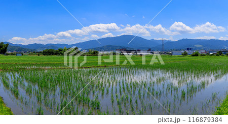 桜井市東新堂 田んぼと外鎌山、鳥見山、音羽山、御破裂山、太陽光発電所 2024年7月5日