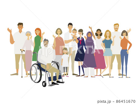 様々な人が並んで手を振っているイラスト