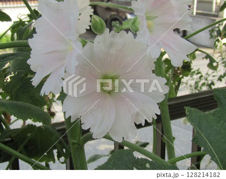 白いタチアオイと桃色の紫陽花と赤いサルビアの花