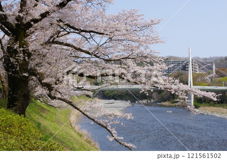 水面に映る満開の桜と宿河原堤の遊歩道 川崎市