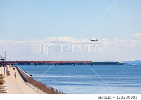 多摩川河口付近からの羽田空港、着陸する飛行機
