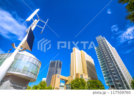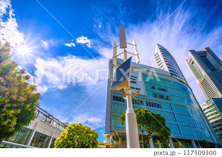 日本の横浜都市景観 JR桜木町駅前広場の再生可能エネルギーを活用した街路灯などを望む=8月17日