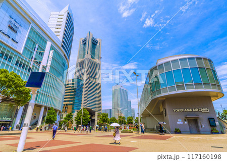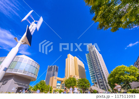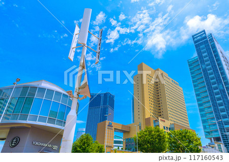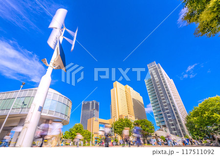 日本の横浜都市景観 JR桜木町駅前広場の再生可能エネルギーを活用した街路灯などを望む=7月18日