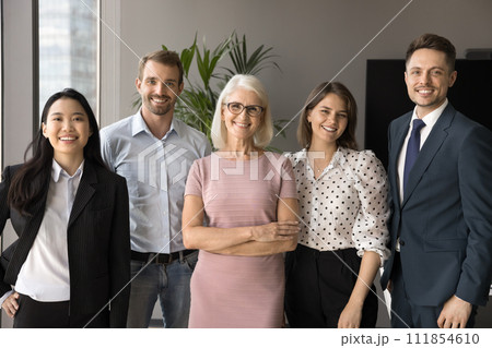 Diverse group of serious multi-ethnic people standing in a row against a white background