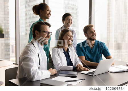 Wide shot of multiethnic young startup business team brainstorming using computer at workplace. African and Caucasian coworkers group discuss corporate project software in teamwork at office desk.