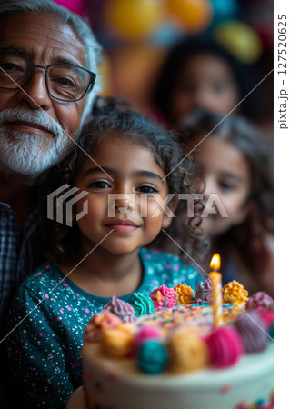 a multicultural extended family celebrating a birthday, with grandparents, parents, and children gathered around a cake