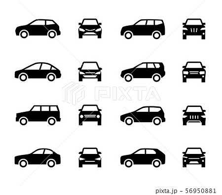 Cars front and side view signs. Vehicle black silhouette vector icons isolated on white background
