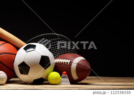 Various sports equipment on black background studio shot