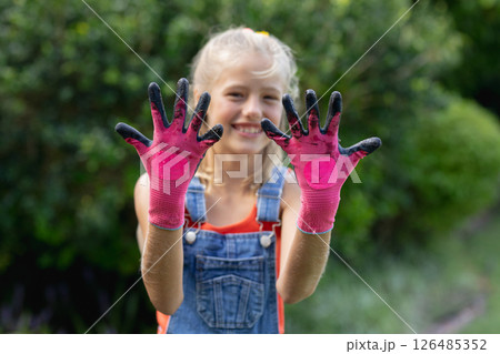 Smiling girl in garden showing dirty hands in pink gloves, enjoying outdoor fun, copy space