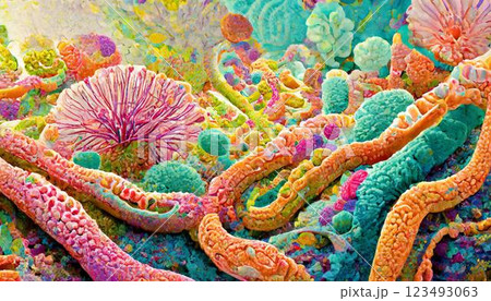カラフルで多様な腸内細菌の善玉菌たちが集まった腸内フローラのイメージの3Dイラスト 腸内環境