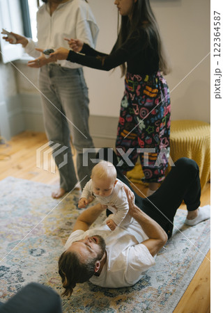 Engaging and Joyful Family Interaction with a Baby Laughing Happily on the Soft Rug