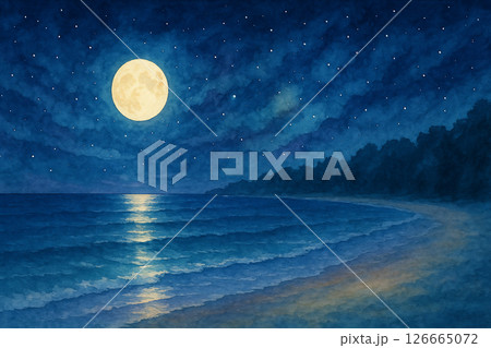 満月に照らされた夜の海と星空、水彩画風の幻想的な風景
