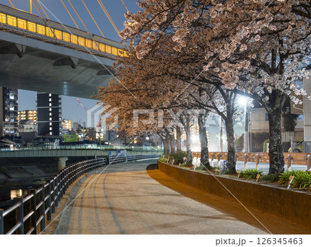 夜の桜並木と川沿いの景色