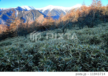 早朝の夜叉神峠の笹原と南アルプス・白峰三山