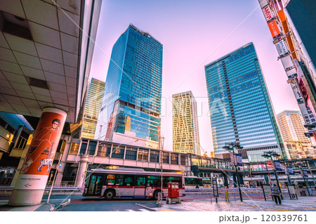 日本の東京都市景観 夜明け…ウェーヴ通り前から渋谷駅やビル群などを望む=11月9日・土、6時52分
