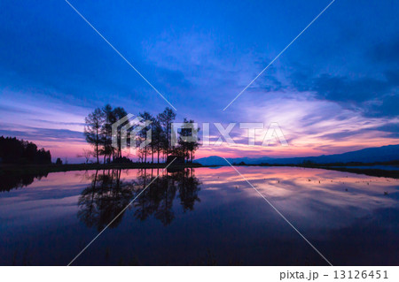 新潟県長岡市 雪解けの進む棚田の、透明感のある青い夜明け