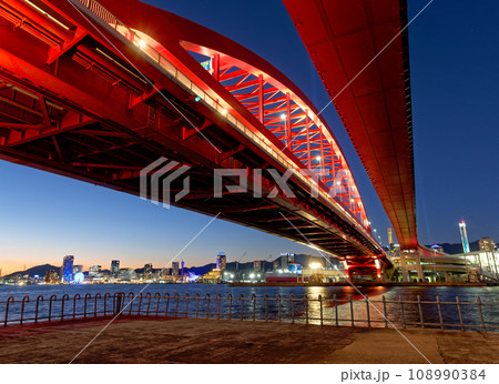 ポートアイランド北公園から見る神戸大橋と市街地の夕暮れ