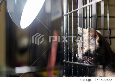 Tabby observing from behind protective cage, Pet feline patiently waiting for loving new home