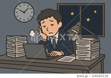 残業するビジネスマン。締め切りに急ぐ、納期、仕事