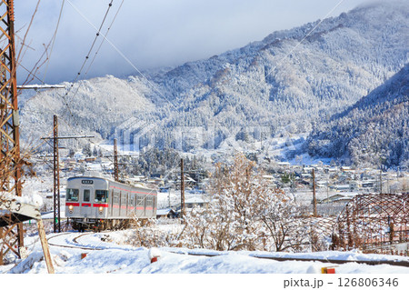 冬の信州吉田駅を発車する長野電鉄長野線3500系