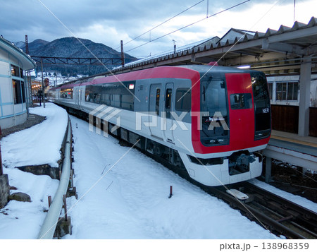 冬の信州吉田駅を発車する長野電鉄長野線3500系