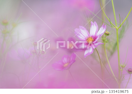 光に包まれるコスモス 玉ボケとパステルカラーの秋のイメージ
