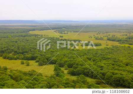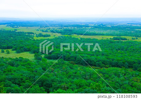 夏の北海道、道東の釧路で眺める雄大な釧路湿原、大いなる大地、湿地帯、釧路市湿原展望台、湿原の森を歩く