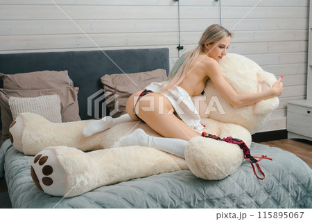 Woman In Pink Lingerie Plays With Large White Teddy Bear On Bed