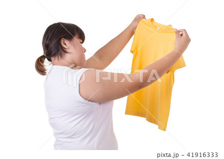 Fat asian woman trying to wear small size of yellow t-shirt isolated on white. Fat and Healthcare concept
