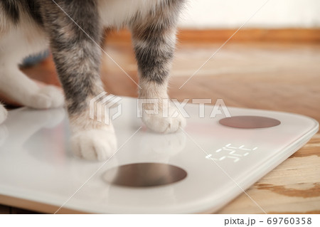 Cat paws stand on smart scales that makes bioelectric impedance analysis, BIA, body fat measurement