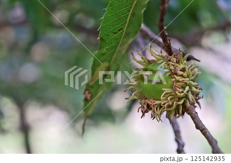 落葉高木ブナ科のクヌギに付いた丸いおおきなドングリ