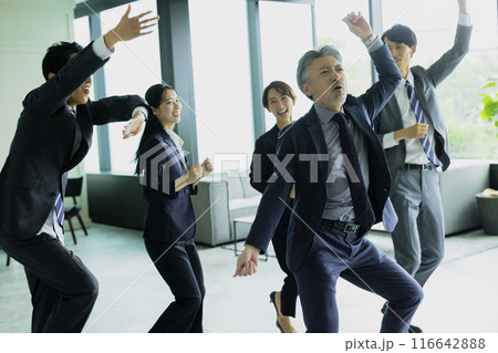 喜ぶオフィスの仲間 撮影協力「LINK FOREST」
