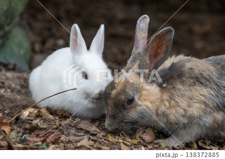 遠くを見つめる子ウサギと食事に夢中な大人のウサギ