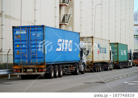 海上コンテナの搬入を待つセミトレーラー・トラックのアップ(SITC)