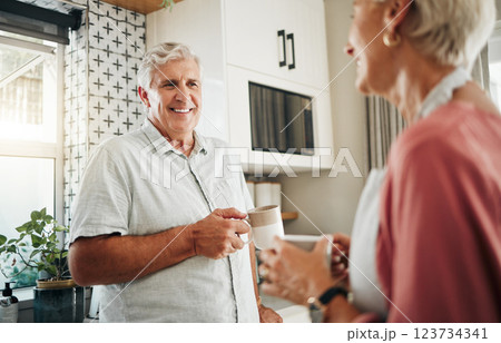 Senior man, drinking coffee and conversation with woman in kitchen at home in New Zealand. Happy, elderly and smile couple enjoy morning tea, chat and relax together in apartment for retirement break
