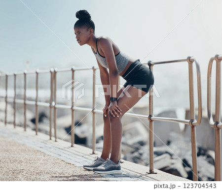 Black woman, athlete and rest while on run outdoor for health, fitness and wellness workout. Tired, runner and in sportswear outside taking breath, relax and fatigue while morning running on trail.