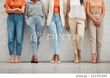 Trendy, fashionable and stylish women standing in a row for a design, marketing or stylist job interview. Casual, elegant and cool young professional females organized, ready and waiting in line